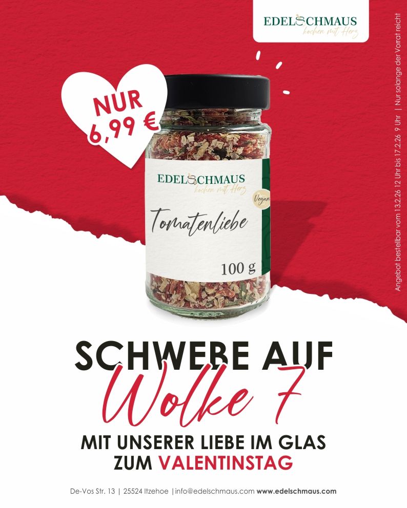 Nur vom 13.02. bis 16.02.2026 verfügbar: Unsere Tomatenliebe hat seit Jahren viele Fans und eignet sich zum Würzen von Suppen und Eintöpfen, Gemüsepfannen, Reis- und Pastagerichten oder als Dip oder Kräuterbutter.